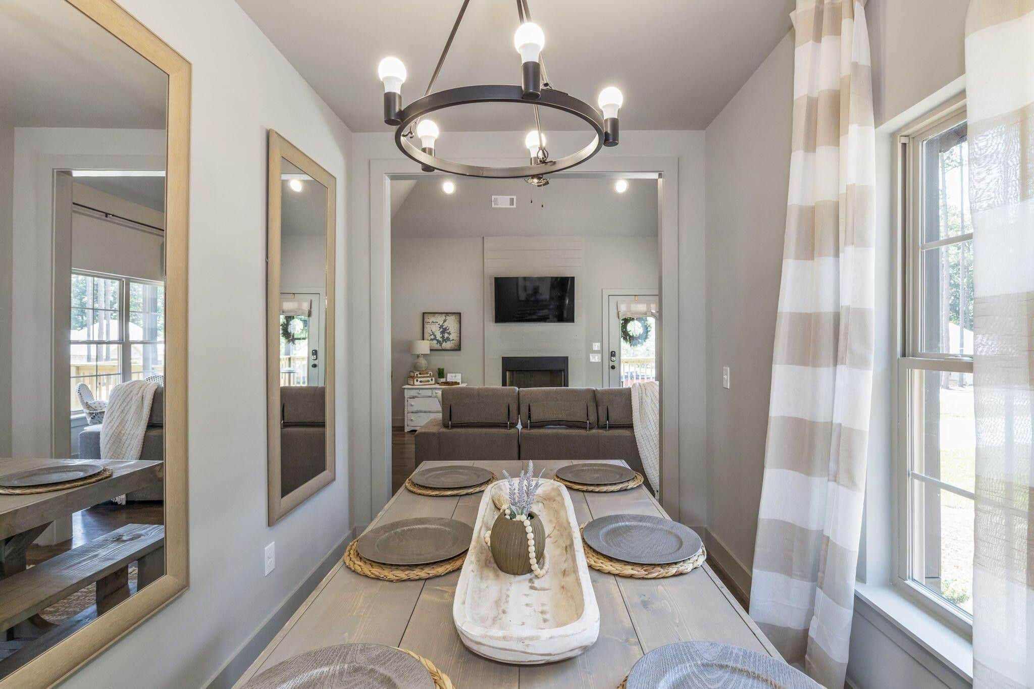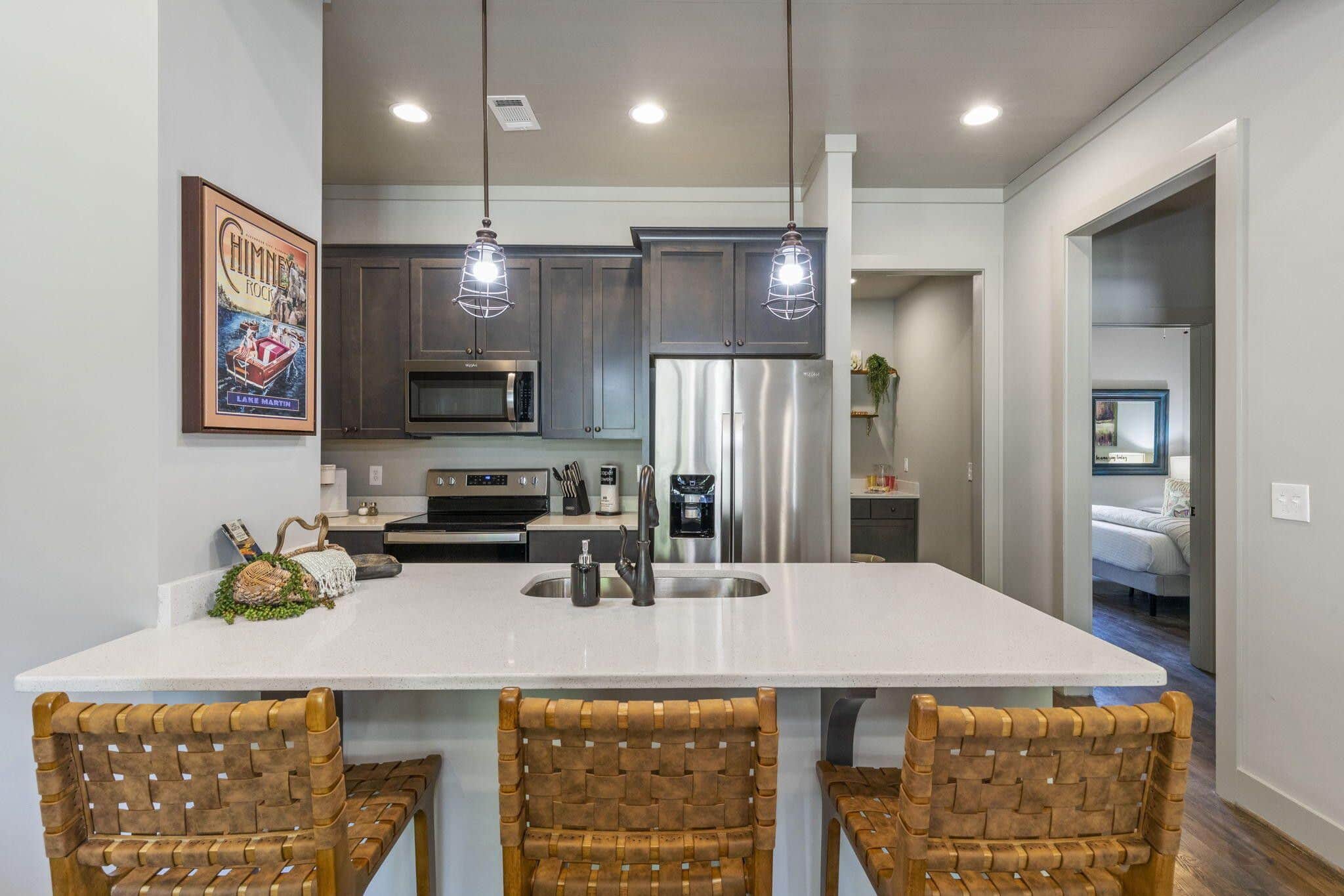 The kitchen is fully equipped with modern appliances including an oven, stovetop, microwave, and refrigerator—perfect for daily meal preparation. A designated dining area provides space for shared meals, with additional seating available at the kitchen island or on the back porch.